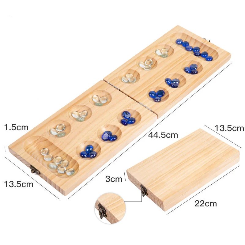 Each player has six small pits (houses) on their side and a larger store (Mancala) to their right.