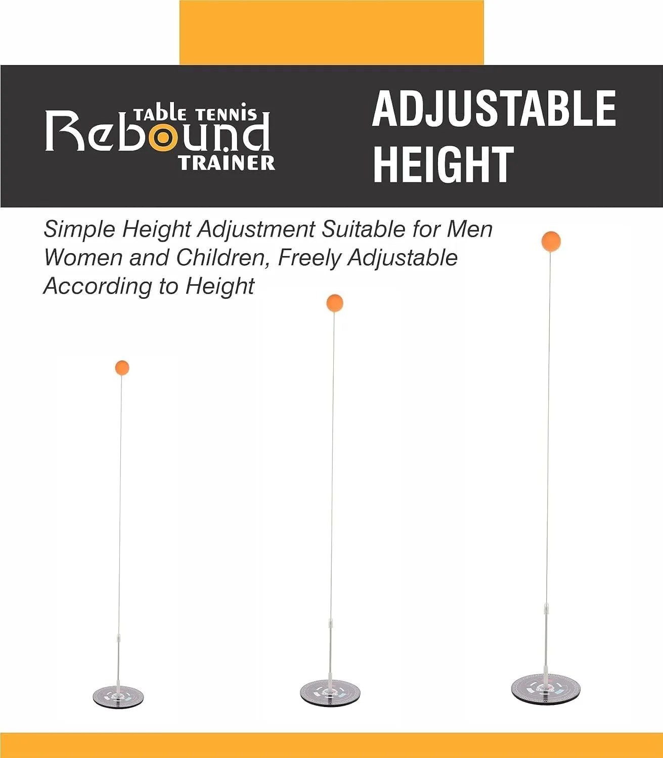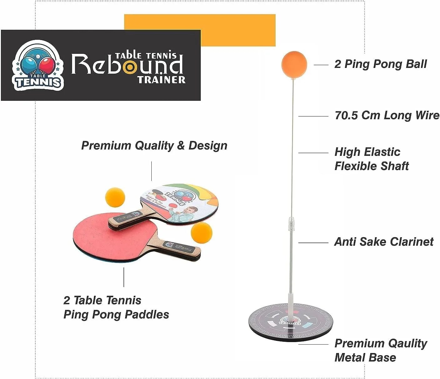 Rebound Trainer: A flexible rod attached to a sturdy base with a table tennis ball on top. The rod rebounds the ball when hit, providing continuous play and practice.